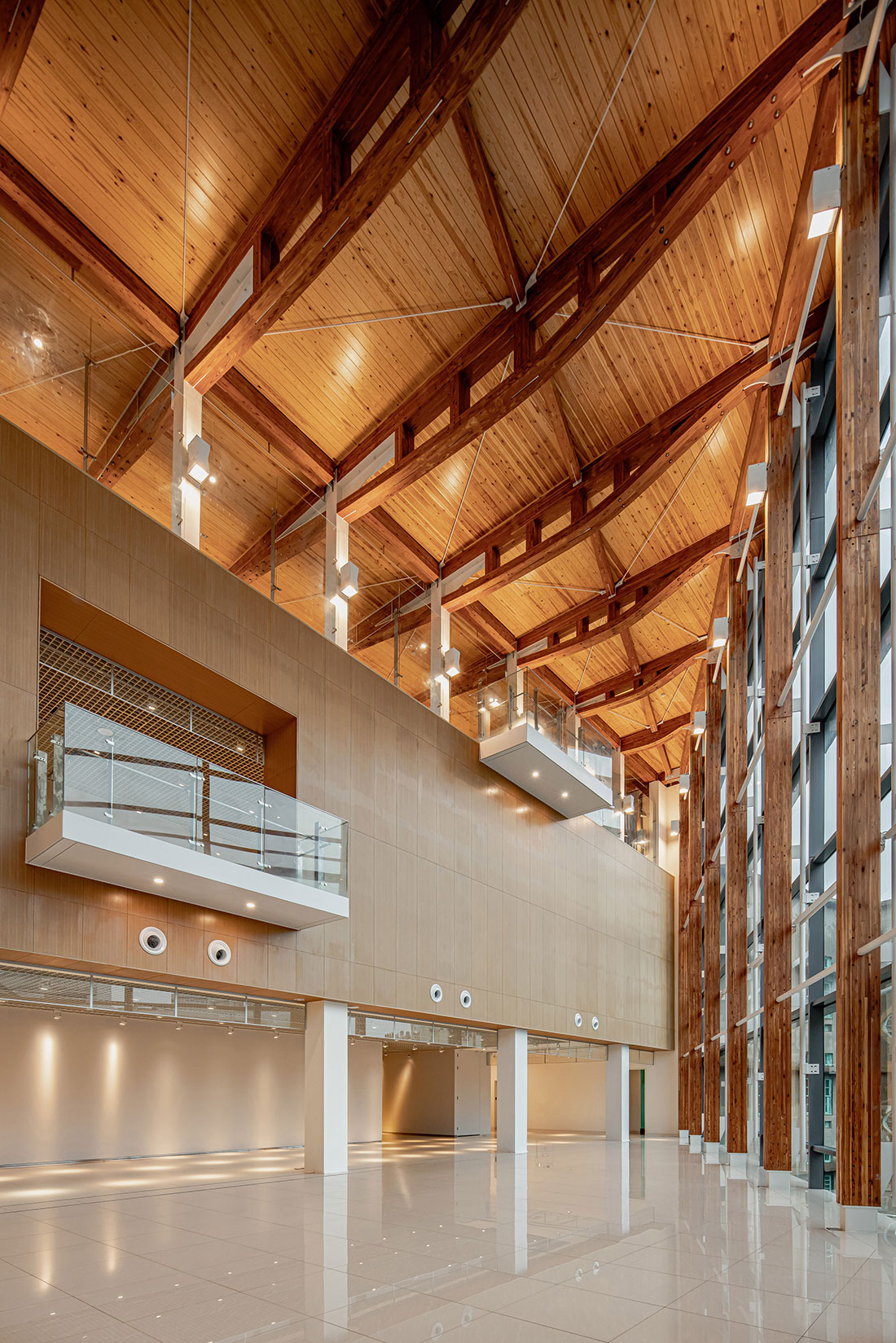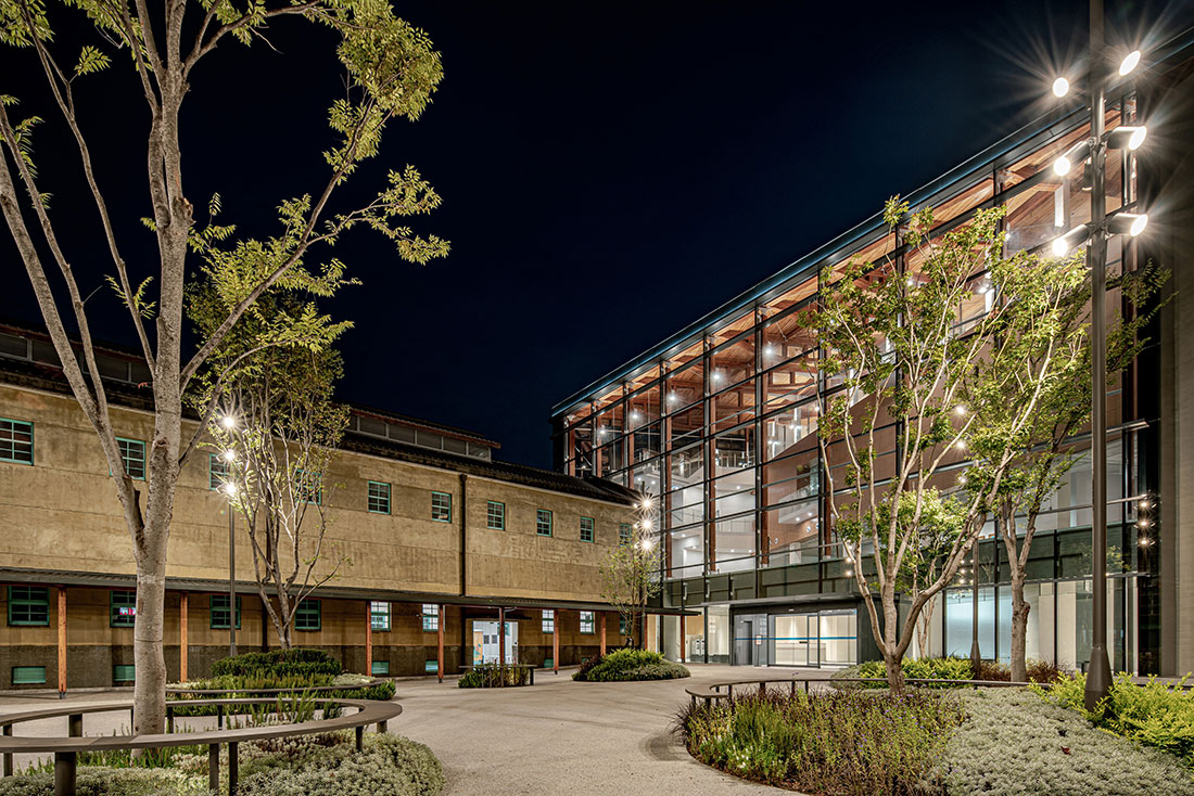 嘉美館面對文化資產保存、修復再利用的新舊融合議題,提出令人耳目一新、具張力的設計,拆除RC外牆、改用輕巧又隔熱的CLT板的減重方式讓舊建築與時俱進,順利進入下一生命周期,也讓原有倉庫立面翻轉為具人文意象的外觀,與古蹟典雅的風貌銜接、形成市街連續的立面。增建的挑空大廳採用集成材木構和帷幕玻璃,成為美術館清新明亮的入口大廳,展示巨幅在地畫作,為「木都」、「畫都」的美名更添佳話。戶外景觀利用「圓」形植穴元素整合三個不同時代的量體,創造了親民的廣場,展現建築、結構、景觀設計專業的合作無間。