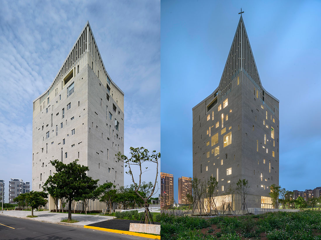 本案在有限的基地上,建築師以立體化的關係、理性與感性兼顧的內外雙層空間系統,梳理了教會文教中心多元複雜的空間需求。在宗教的「神性」與俗世的「人性」之間取得平衡,皮層孔洞、屋頂天窗,光線試圖為此間的翻譯,賦予此建築雕塑般的形象,建築師展現了細膩的美學能力,而營建技術的到位,更賦予了此一建築完美而精準的詮釋。
