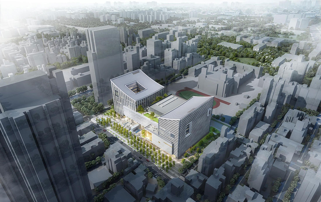 圖書館與音樂廳外牆的構成分別啟發自古代竹簡書籍,與西洋五線譜的單純線條,就像是竹簡填入文字便成為了書冊,五線譜填入音符,便譜出豐富的樂章一樣,以最簡單的線條美學塑造其優美的造型。在夜色來臨時,交響樂廳、多媒體排練實驗空間、國際會議廳轉變為發光的盒子,發散出溫潤的微光,低調靜默地展現出獨特的文藝氣息。
