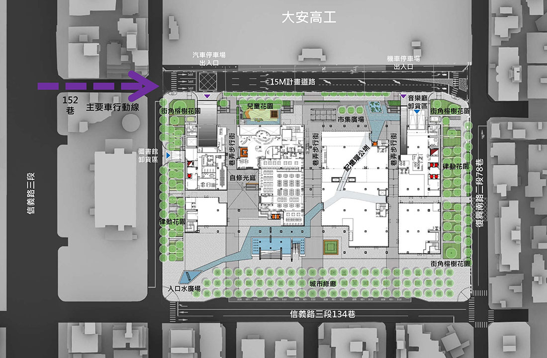 針對音樂廳與新圖書總館規劃設計構想,大元聯合建築師事務所表示,本案不在大街上或廣場中,而是座落在信義路後方的街巷中,正是讓臺北市創造一個獨一無二、充分具有臺北特色、貼近市民生活的文化場所的絕佳機會。兩項設施將在地面層保留街巷的空間,讓民眾無礙地穿越,並且與鄰近的街廓維持視覺的延續,提供民眾在此徜徉、漫步、交流、會面或沈思的自由空間。