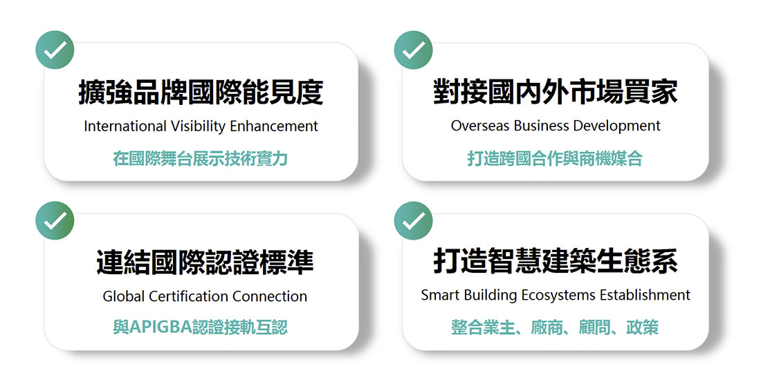 亞太地區智慧綠建築聯盟集結超過十個國家的相關協會支持,並將派出多國會員聯盟參訪團來台,為展會注入強大的國際動能。主辦單位台灣智慧建築協會表示,展會的重要使命之一,正是協助亞太智慧建築領導品牌提升國際能見度,讓技術實力在全球舞台上被看見。透過精準的買家邀請與跨國媒合機制,促成技術輸出、專案合作與投資對接,讓智慧建築不只停留在展示層面,而是轉化為實質商機。