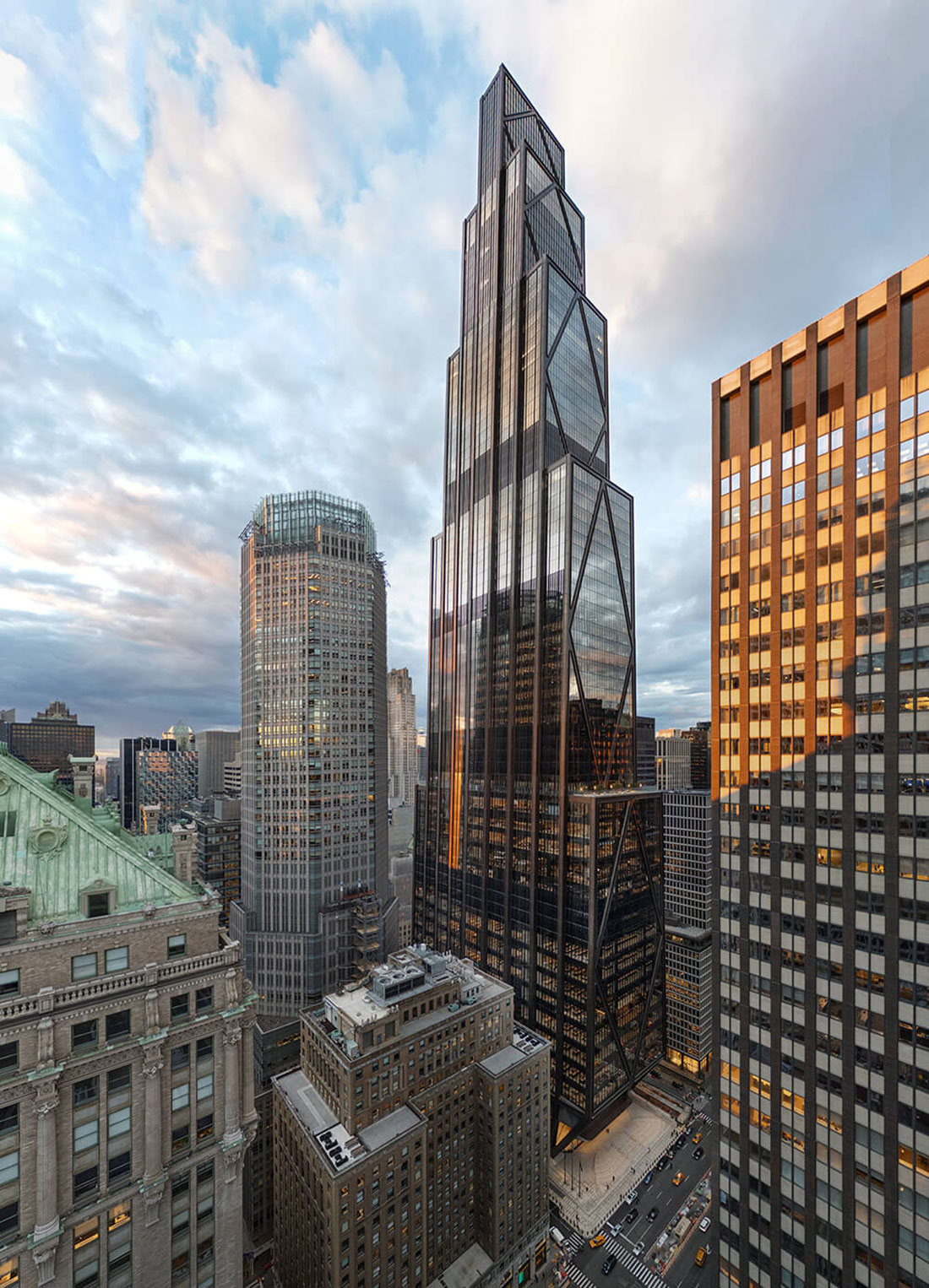 在設計概念上,270 Park Avenue 明確「結構即建築,建築即結構」的設計核心,而非將工程系統隱藏於玻璃帷幕之後。設計團隊刻意把扇形結構柱、三角形支撐系統,以及立面可清楚辨識的 「青銅色對角支撐」納入整體建築語言,使建築在遠觀天際線或近距離行走於街道時,都能被看到的承重架構。而青銅色金屬包覆的斜向構件代表的是工程構件在建築層面的轉譯。其色澤與質地被用來傳達重量感、耐久性與時間性,在大面積玻璃帷幕之間形成穩定而有節奏的立面構成,避免超高層建築常見的扁平化與尺度消失。設計師在多次訪談中指出,這種將結構直接外顯的作法,延續了 Park Avenue 一帶企業總部建築以秩序、穩定與可控性作為核心語彙的傳統,同時也滿足金融機構對長期性與制度感的企業形象期待。