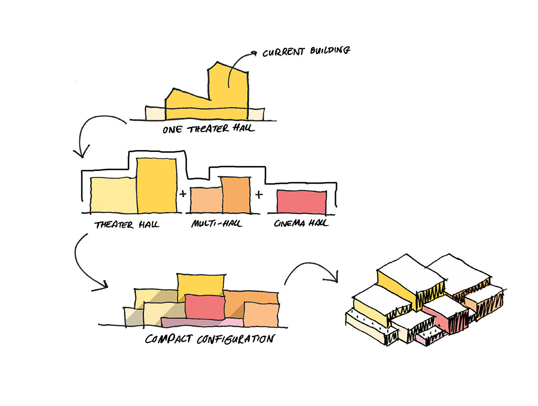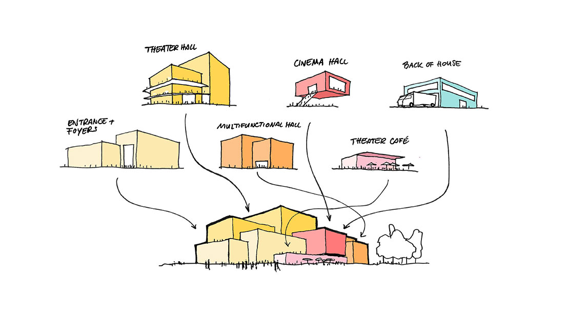 圖:由三座劇場、門廳空間、咖啡廳與後勤區域所構成的六個量體,被緊密整合為一棟完整的建築。© MVRDV