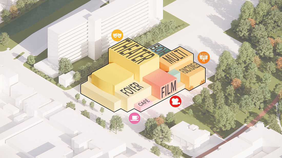 圖:在 MVRDV 為全新 Lampegiet 劇院所提出的設計中,每一座劇場與各項功能空間皆各自形成獨立的建築量體。© MVRDV