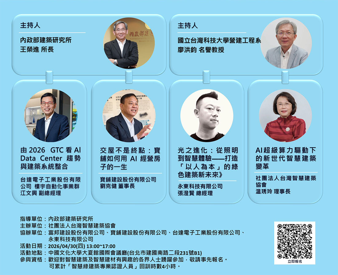 本次論壇將聚焦 AI 超級算力如何改變建築產業的設計、建置、維運與管理模式,並從 Data Center、系統整合與綠建築應用等面向,深入探討智慧建築未來發展方向。活動將邀請產業專家與技術代表分享實務經驗,協助建築、機電、資通訊、系統整合、物業管理與智慧城市相關從業人員,理解 AI 算力導入後所帶來的新價值與新挑戰。